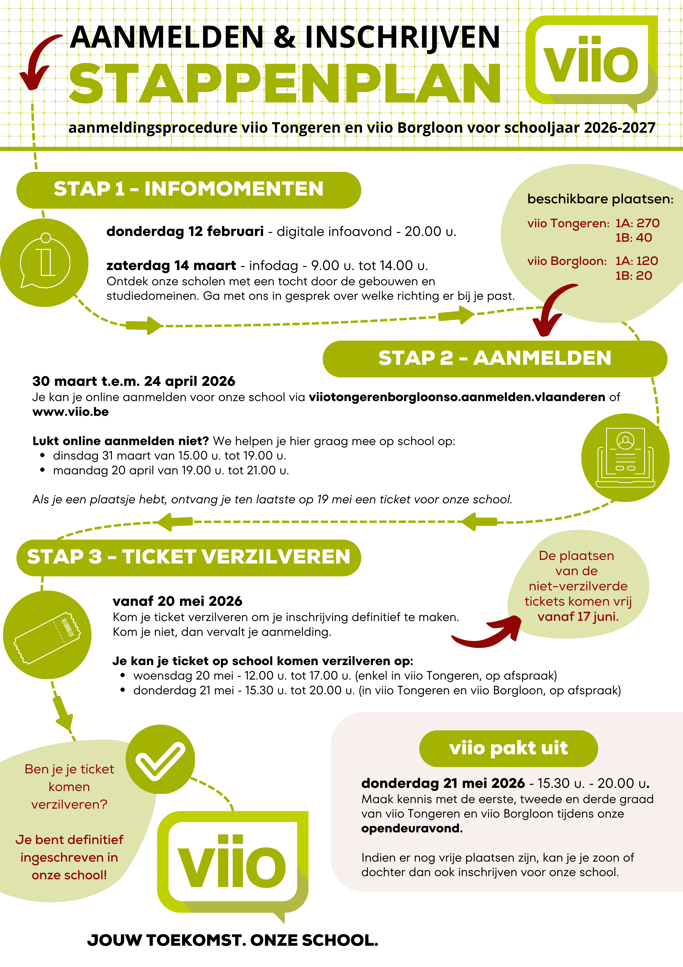 Kom je ticket verzilveren op school om zo je inschrijving definitief te maken. Kom je niet, dan vervalt de inschrijving!