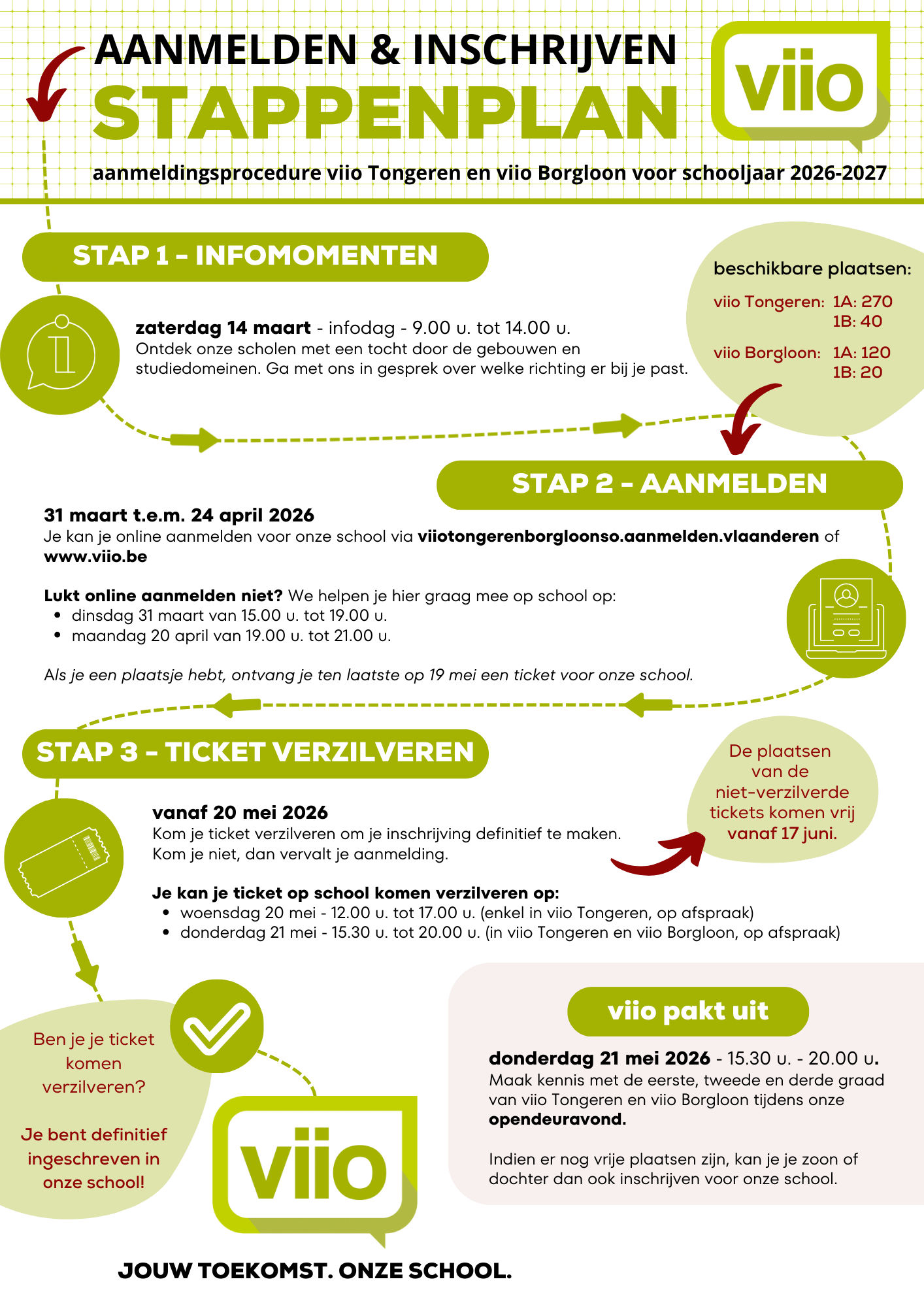 Kom je ticket verzilveren op school om zo je inschrijving definitief te maken. Kom je niet, dan vervalt de inschrijving!
